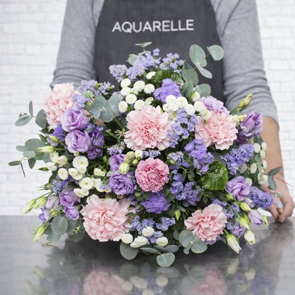 Our florist chose the softests shades of spring to to compose this charming bouquet of ‘Essina’ dianthus, dainty white camomille, mauve lisianthus, lavender statice and deep violet ageratum. Surrounded by a few stems of fragrant eucalyptus, these beautiful seasonal flowers make an irresistible gift.